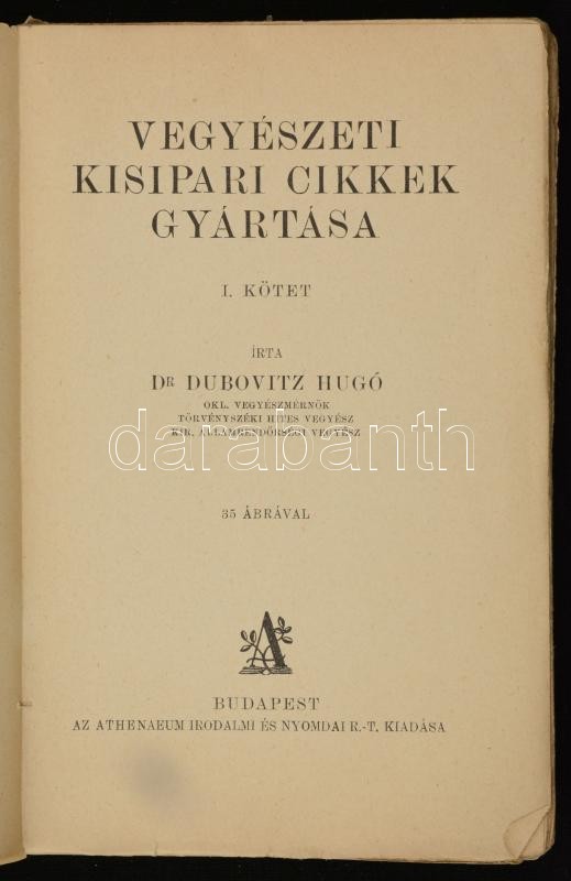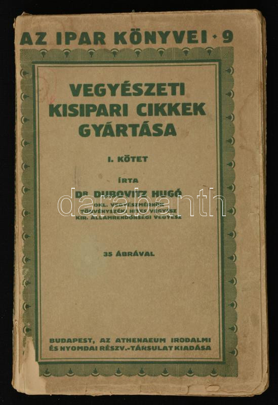Leírás: Dr. Dubovitz Hugó: Vegyészeti kisipari cikkek gyártása I. kötet. Ipar könyvei 9. Bp., é.n., Athenaeum Irodalmi és Nyomdai Rt. Kiadói papírkötés, szakadozott, foltos borítóval, sérült kötéssel, szövegközti fekete-fehér illusztrációkkal.