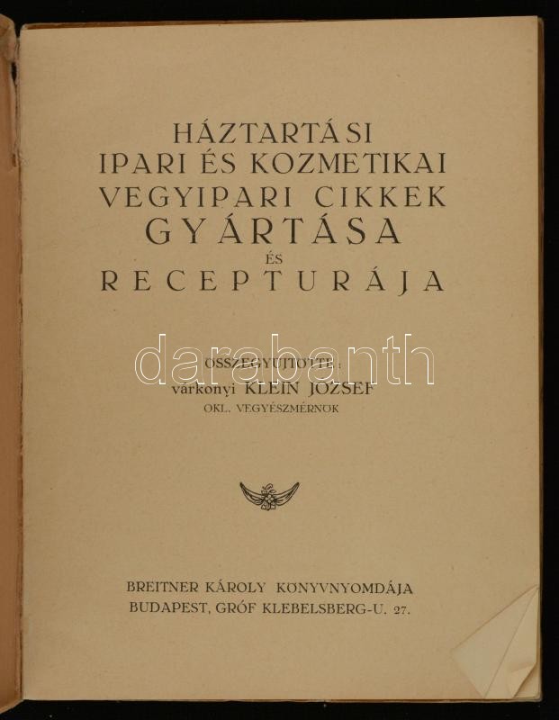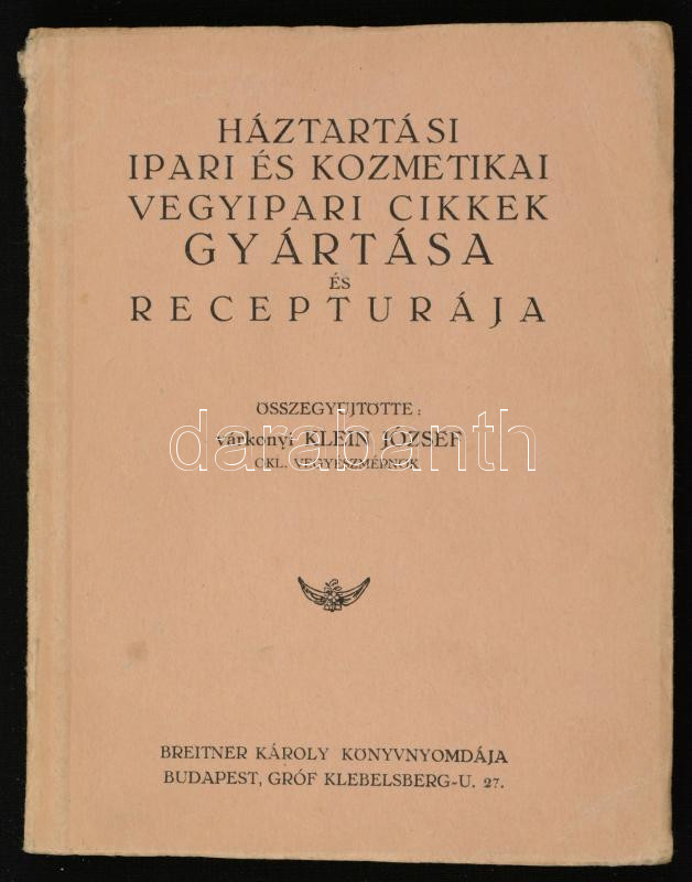 Háztartási, ipari és kozmetikai vegyipari cikkek gyártása és receptúrája. Összeállította: várkonyi Klein József. Bp., é.n, Breitner Károly Könyvnyomdája. Kiadói kissé szakadt papírkötés.