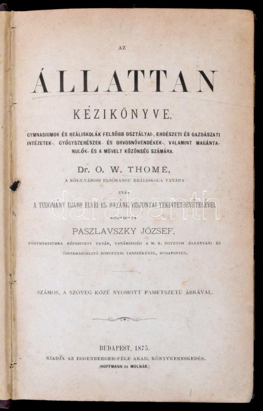 Paszlavszky József: Az állattan kézikönyve. Gymansiumok és reáliskolák felsőbb osztályai-, erdészeti és gazdászati intézetek-, gyógyszerészek- és orvosnövendékek-, valamint magántanulók- és a művelt közönség számára. Dr. O. W. Thomé után írta Paszlavszky József. Bp., 1875, Eggenberger-féle Akad. Könyvkereskedés (Hoffmann és Molnár.) Korabeli kopottas félvászon kötés, ceruzás aláhúzásokkal, számos szövegközti fametszetű illusztrációkkal.