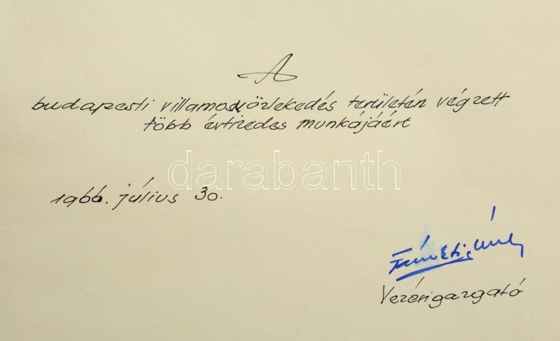 A Budapesti Közúti Vasút 100 éve. Szerk.: Csuhay Dénes. Bp., 1966, Közlekedési Dokumentációs Vállalat. Kiadói aranyozott egészvászon kötés, vezérigazgatói aláírással és ajándékozási sorkkal.