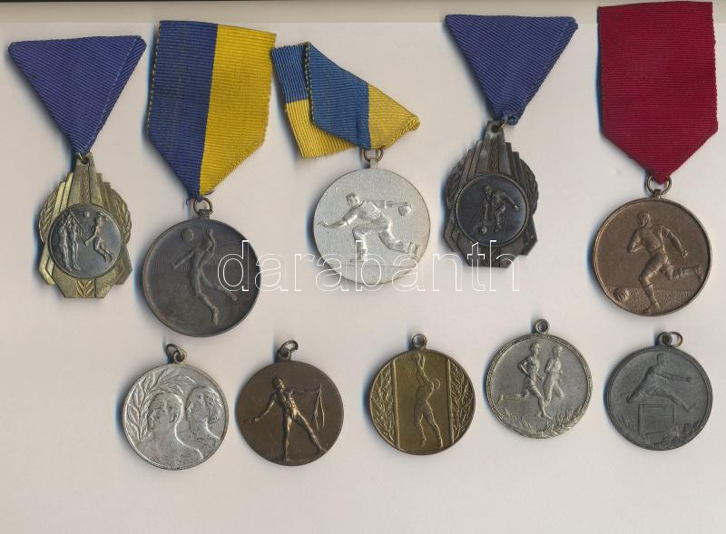 Leírás: 10db vegyes szocialista fém és bronz sportérem több szalaggal, közte "1951 évi MHK postaverseny I." fém sportérem T:2,2-