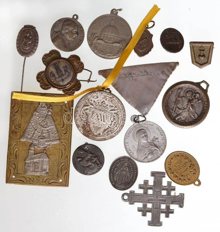 Leírás: 15db-os vegyes kegyérem, medál, jelvény és kitűző tétel, közte DN "Pax - Boldogasszony éve" fém kitűző T:2,2-