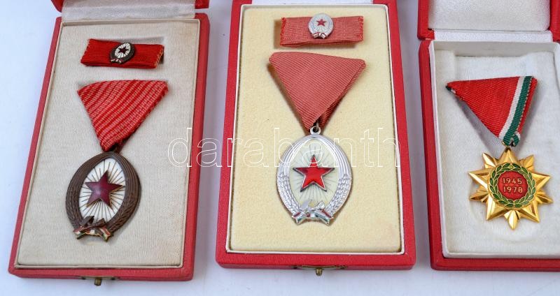 Leírás: 1964. "Munka Érdemrend" bronz fokozata (3x) és ezüst fokozata, Br kitüntetés mellszalagon, miniatűrrel és szalagsávval, tokban + 1969. "Felszabadulási Jubileumi Emlékérem" aranyozott Br kitüntetés mellszalagon + 2db kitüntetés tárolására alkalmas tok T:2