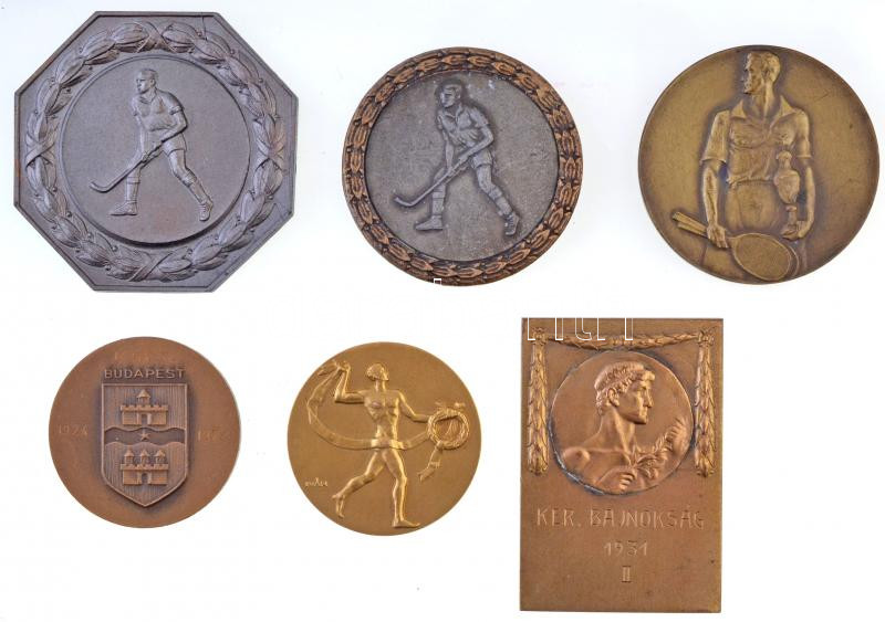 Leírás: 6db-os sport- és díjérem tétel, közte 1931. "P.S.C. 1931 Férfi E. II." fém díjérem "Huguenin" gyártói jelzéssel (50mm), Iván István (1905-1968) 1950. "M.K.H.SZ. 1948/49. Szövetségi Díj I." aranyozott díjérem (40,5mm) T:2,2-
