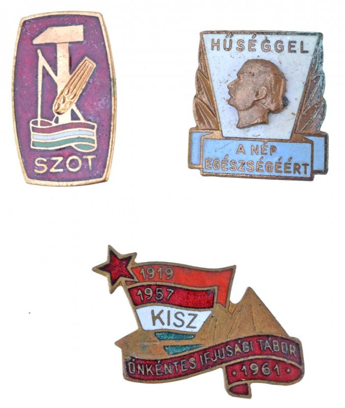 Leírás: 6db-os vegyes magyar jelvény és kitűző tétel, közte "SZOT", "KISZ Önkéntes Ifjúsági Tábor 1961" T:2