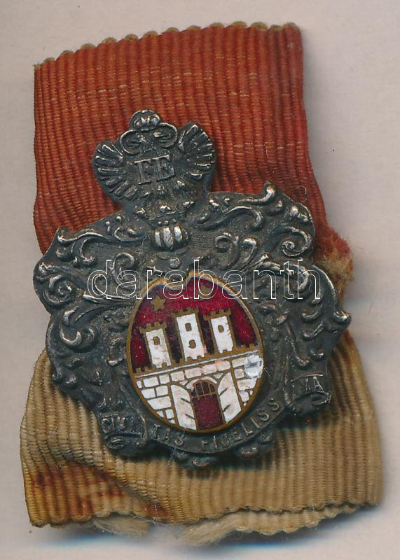 Leírás: ~1930-1940. "Civitas fidelissima" Sopron város címerével ellátott zománcozott fém jelvény szalaggal (30x25mm) T:2- patina