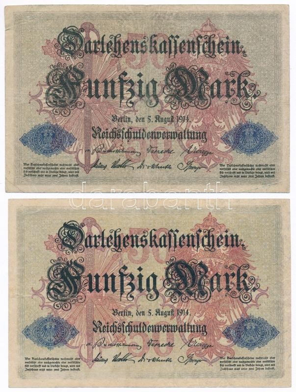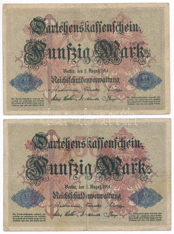 German Empire 1914. 50 Mark (5x)... https://www.darabanth.com/hu/282-Gyorsarveres/282.0/Numizmatika/Kulfoldi-bankjegyek~300011/Nemet-Birodalom-1914-50M-5x-TIII--German-Empire-1914-50-Mark-5x-CF~II1453741