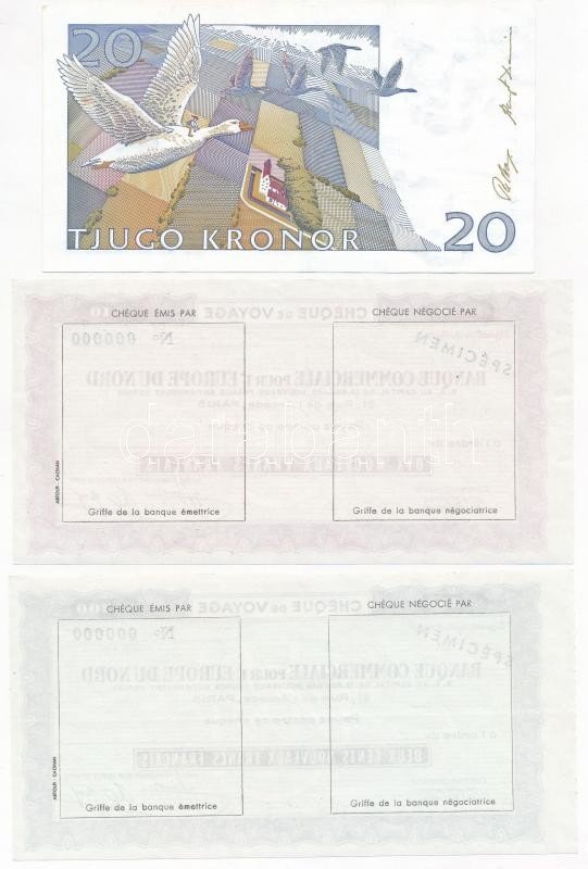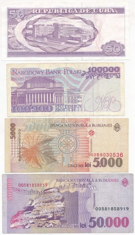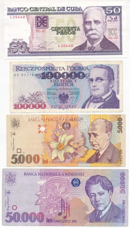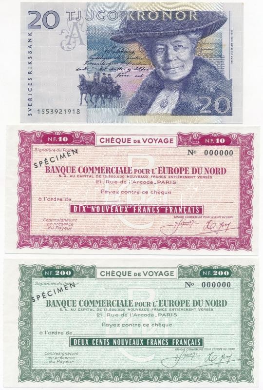 Vegyes: Kuba 2004. 50P + Lengyelország 1993. 100.000Zl + Románia 1996. 50.000L + 1998. 5000L + Svédország ~1991. 20K + Franciaország DN "Banque Commerciale pour l'Europe du Nord" utazási csekk "MINTA" felülbélyegzéssel (2x) 2c és 10Fr értékben T:I--III