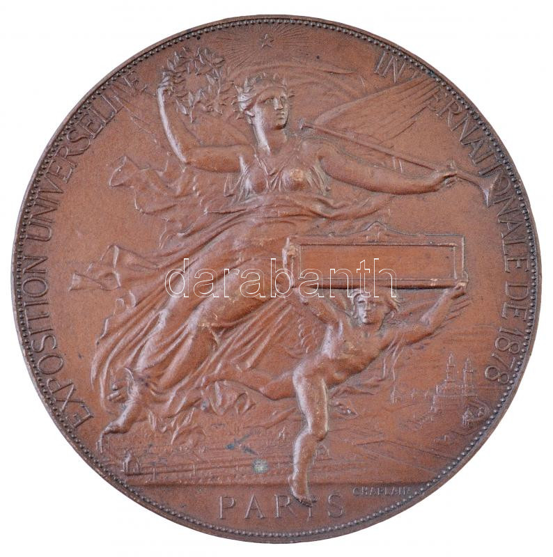 Leírás: Franciaország 1878. "Nemzetközi Világkiállítás 1878 - Párizs" Br emlékérem, hátoldalon csavaros rögzítővel. Szign.: Chaplain (68mm) T:2 ph.