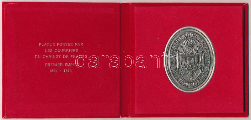 Franciaország DN "A Francia Külügyminisztérium futára" ezüstözött fém plakett, Első Császárság idején használt plakett modern utánverete, bársony tokban rögzítve (a plakett 54x69mm, a tok 121x122mm) T:1