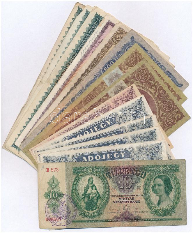 15db-os vegyes pengő és adópengő tétel, közte 1936. 10P "Debreczen Sz. K. Város Törvényhatósága" hamis felülbélyegzéssel (banknote with fake overprint) T:III,III-