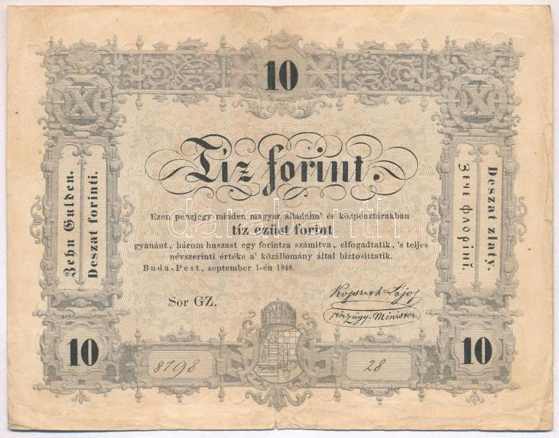 Leírás: 1848. 10Ft "Kossuth Bankó" T:III kis szakadás