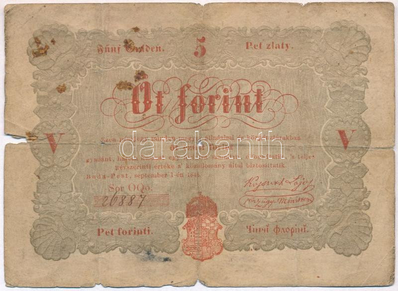 1848. 5Ft "Kossuth bankó" vörösesbarna T:III- ly., szakadás https://www.darabanth.com/hu/282-Gyorsarveres/282.0/Numizmatika/Magyar-bankjegyek~300006/1848-5Ft-Kossuth-banko-vorosesbarna-TIII-ly-szakadas~II1460006