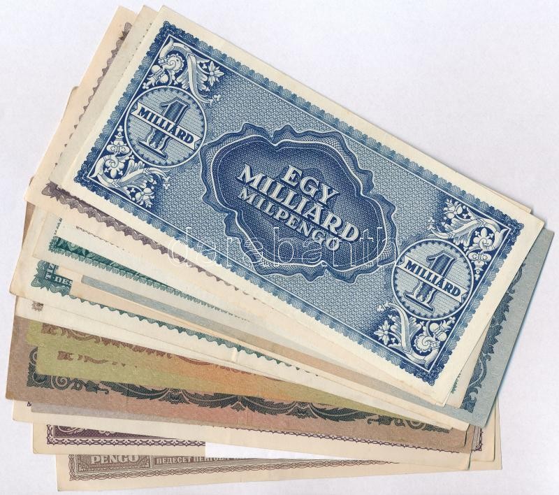 Leírás: 1945-1946. 20db-os inflációs bankjegy gyűjtemény, benne: 1945. 50P + 1945. 100P vízjeles papíron, "N" betű fölött festékhiány + 1945. 100P + 1945. 500P magyar "N" betű az orosz "P" helyett + 1945. 500P + 1945. 1000P + 1945. 1000P piros "MNB" bélyeggel + 1945. 10.000P eltolódott zöld alapnyomat a címernél + 1945. 10.000P barna "MNB" bélyeggel + 1945. 100.000P + 1945. 1.000.000P + 1945. 10.000.000P + 1946. 100.000.000P + 1946. 1.000.000.000P + 1946. 10.000MP + 1946. 100.000MP + 1946. 1.000.000MP + 1946. 10.000.000MP + 100.000.000MP + 1946. 1.000.000.000MP T:I-III