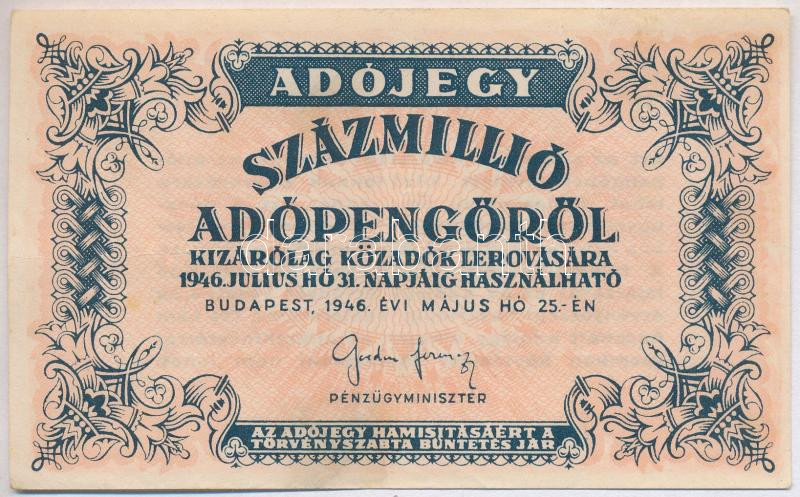 1946. 100.000.000AP T:III https://www.darabanth.com/hu/282-Gyorsarveres/282.0/Numizmatika/Magyar-bankjegyek~300006/1946-100000000AP-TIII~II1459842