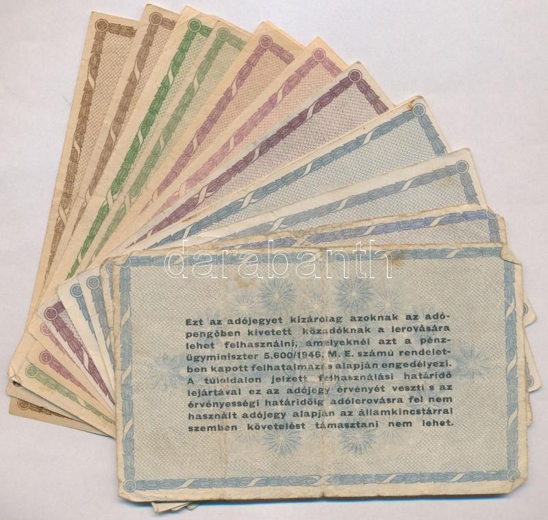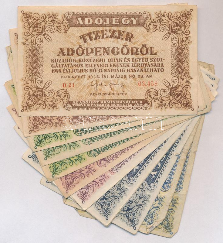 Leírás: 1946. 14db-os adópengő tétel, benne: 1946. 10.000AP (2x) + 1946. 50.000AP (4x) 1db sorozat és sorszám nélkül vízjeles papíron + 1946. 100.000AP (3x) 1db sorozat és sorszám nélkül, vastagabb fehér papíron "5.600" + 1946. 500.000AP (3x) + 1946. 10.000.000AP (2x) T:III,III-