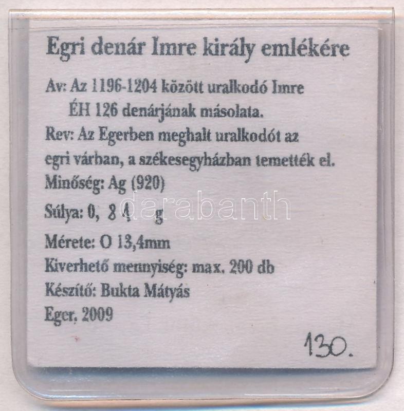 Leírás: Bukta Mátyás 2009. "Egri denár Imre király emlékére / MÉE Eger" Ag emlékérem számozott tanúsítvánnyal (0,81g/0.920/13,4mm) T:1