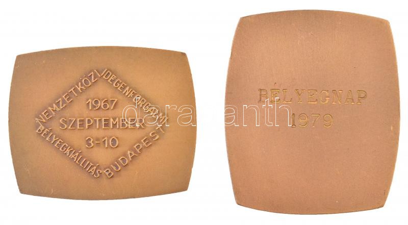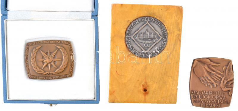 Leírás: Iván István (1905-1968) 1963. "Nemzetközi Bélyegkiállítás - SOCPHILEX" ezüstözött fém plakett, fa talpon (49mm) + 1967. "Nemzetközi Idegenforgalmi Bélyegkiállítás - Budapest 1967. Szeptember 3-10." Br plakett eredeti tokban (48,5x60mm) + ~1979. "Magyar Bélyeggyűjtők Országos Szövetsége" Br plakett (55x64,5mm) T:2