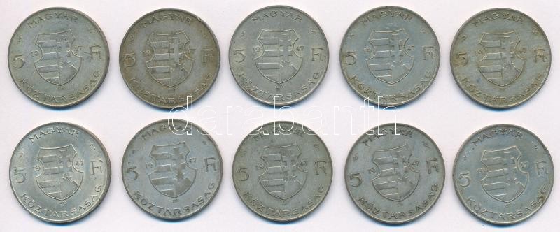 1947. 5Ft Ag "Kossuth" (10x) T:2-,3 patina https://www.darabanth.com/hu/282-Gyorsarveres/282.0/Numizmatika/Magyar-es-magyar-verdejelu-fem-es-ezustpenzek~300007/1947-5Ft-Ag-Kossuth-10x-T2-3-patina~II1459511