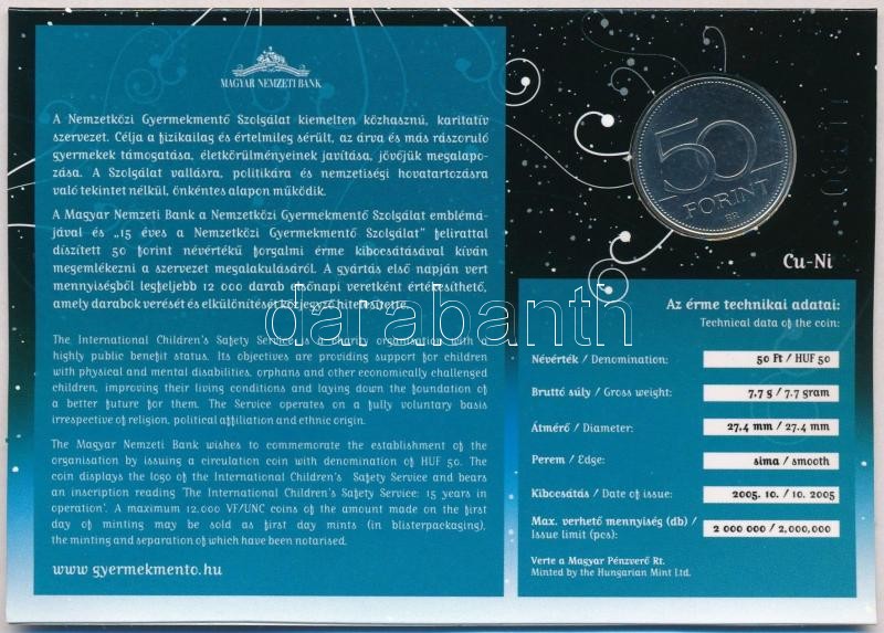 2005. 50Ft Cu-Ni "15 éves a Nemzetközi Gyermekmentő Szolgálat&quo... https://www.darabanth.com/hu/282-Gyorsarveres/282.0/Numizmatika/Magyar-es-magyar-verdejelu-fem-es-ezustpenzek~300007/2005-50Ft-Cu-Ni-15-eves-a-Nemzetkozi-Gyermekmento-Szolgalat-elsonapi-veret-sorszamozott-eml~II1457523