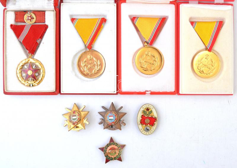 Leírás: 1964. "Kiváló Szolgálatért Érdemrend" aranyozott, ezüstözött, zománcozott Br kitüntetés mellszalagon, miniatűrrel és szalagsávval, tokban + 1983. "Honvédelmi Érdemérem" 10 év szolgálat után, aranyozott Br kitüntetés mellszalagon, tokban (3x) + DN "KTP (Katonai Tíz Próba)" Br jelvény + DN "Kilián Hadi Torna" aranyozott Br jelvény + DN "Munkásőr" zománcozott jelvény + DN "Kiváló Növendék" zománcozott jelvény T:2