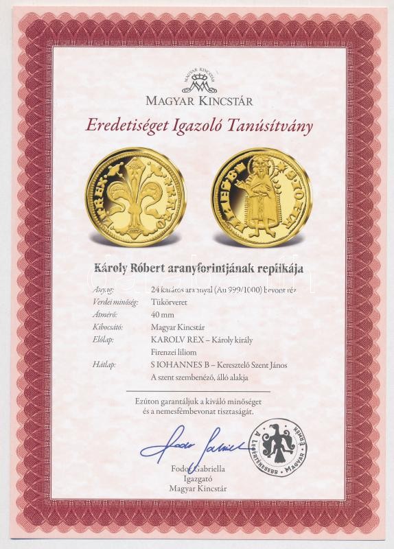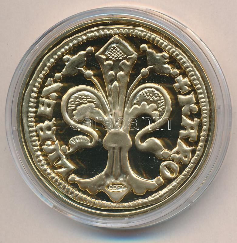 Leírás: DN "A legértékesebb magyar érmék - Károly Róbert aranyforintjának replikája" aranyozott Cu emlékérem "COPY" beütéssel, tanúsítvánnyal (40mm) T:PP