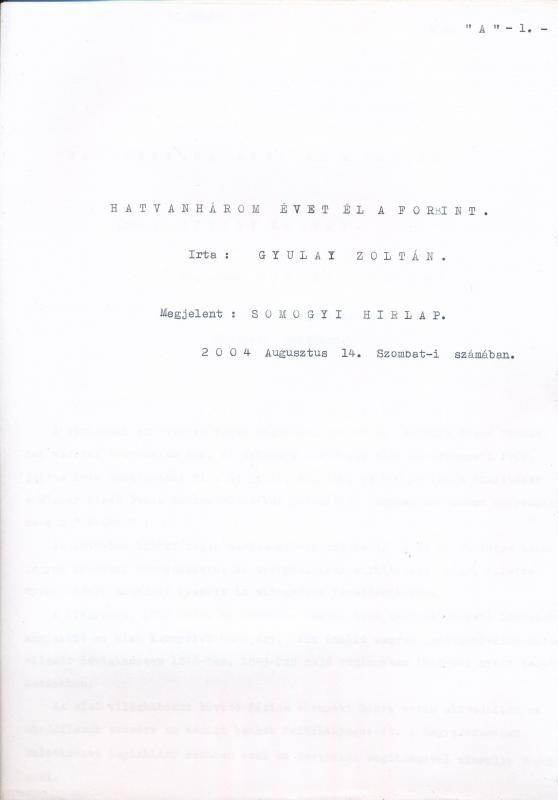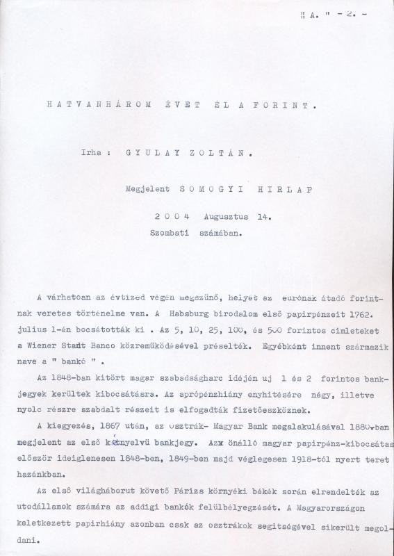 Két darab újságcikk gépelt másolata: Rab Ferenc: "Harmincéves a Forint", Dunántúli Napló 1976. július 31. + Gyulay Zoltán: "Hatvanhárom évet élt a Forint", Somogyi HÃrlap 2004. augusztus 14., az újságcikk eredetijének kivágásával