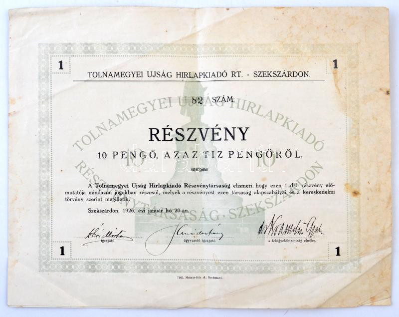 Leírás: Szekszárd 1926. "Tolnamegyei Újság Hírlapkiadó RT." részvénye 10P-ről szelvényekkel T:III fo.