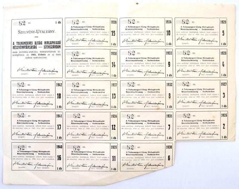 Szekszárd 1926. "Tolnamegyei Újság Hírlapkiadó RT." részvény... https://www.darabanth.com/hu/282-Gyorsarveres/282.0/Numizmatika/Reszvenyek-es-sorsjegyek~300004/Szekszard-1926-Tolnamegyei-Ujsag-Hirlapkiado-RT-reszvenye-10P-rol-szelvenyekkel-TIII-f~II1409314