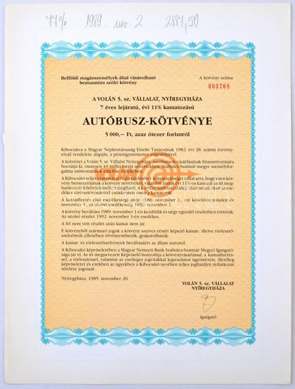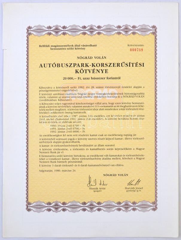 Leírás: Veszprém 1985. "Balaton Volán, Veszprém magasabb színvonalú fuvarozás" kötvénye 10.000Ft-ról + Nyíregyháza 1985. "A Volán 5. sz. Vállalat, Nyíregyháza" autóbusz-kötvénye 5000Ft-ról + Salgótarján 1986. "Nódrág Volán autóbuszpark-korszerűsítési" kötvénye 20.000Ft-ról T:II,II-