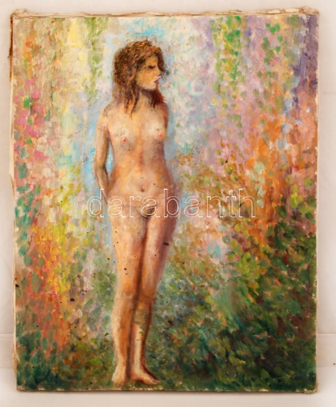 Leírás: Jelzés nélkül: Akt. Olaj, vászon, foltos, 50×40 cm