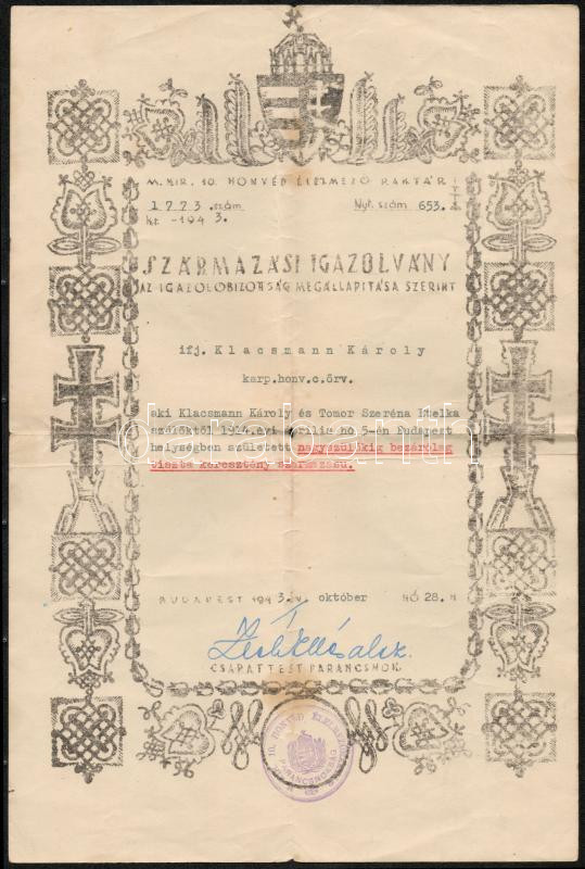 Leírás: 1943 Bp., Tiszta keresztény származást igazoló származási igazolvány katona részére
