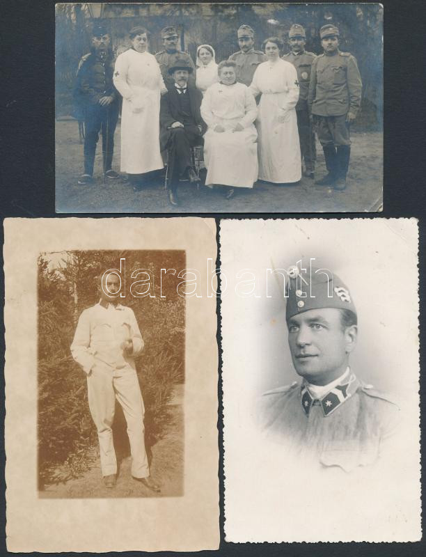 Leírás: cca 1915-1941 3 katonai fotólap, egyiken katonák vöröskeresztes nővérekkel, 9x14 cm