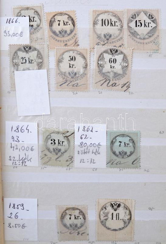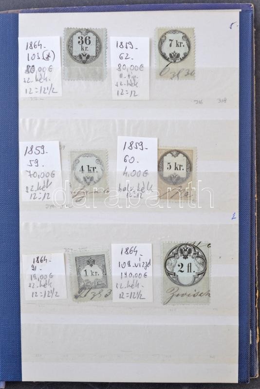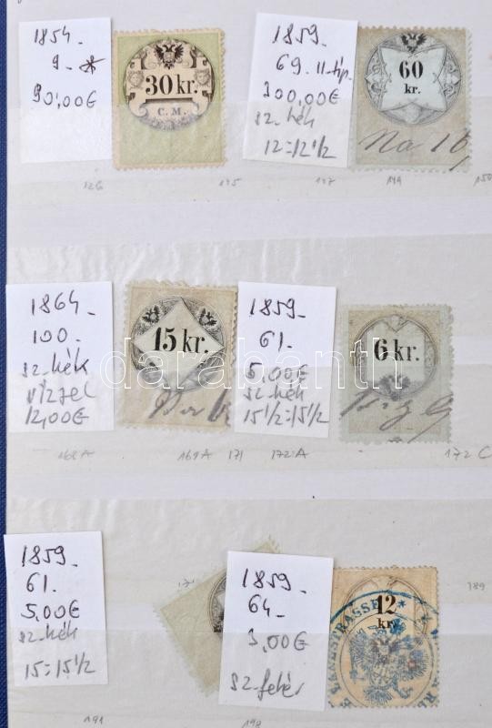 Leírás: 1854-1881 Illetékbélyeg összeállítás jobbakkal katalógus sorrendben, 10 lapos közepes berakóban (Mi EUR 2.454,70)