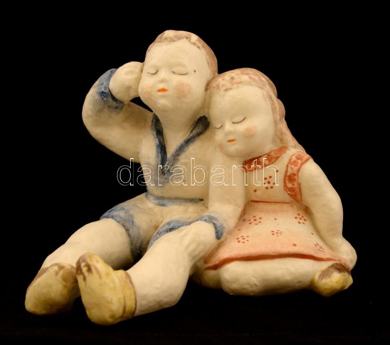 Leírás: Jelzett gyermekek figurapár, kézzel festett, alján öntési hibával, 9x7 cm