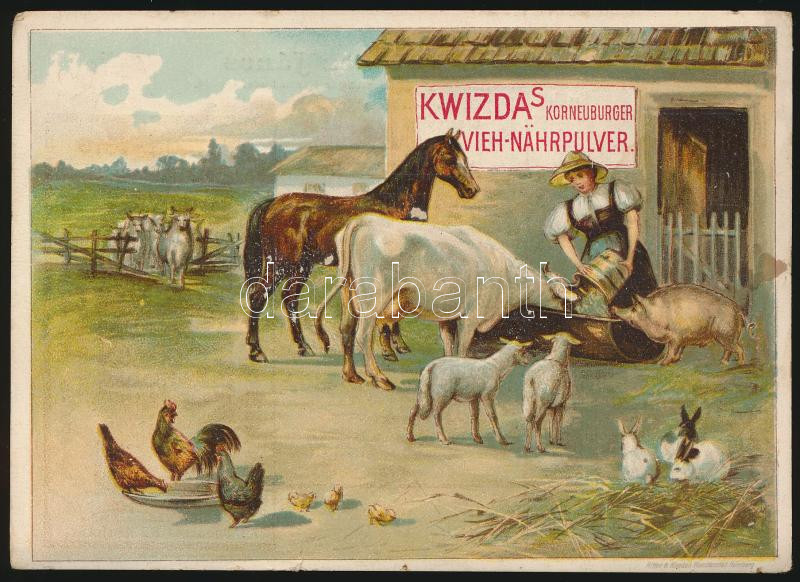cca 1910 Kwizda's Korneuburger Vieh-Nährpulver litho reklámkártyája, 1... https://www.darabanth.com/hu/283-Gyorsarveres/283.0/Festmeny-mutargy-papirregiseg-egyeb/Reklam~21/cca-1910-Kwizdas-Korneuburger-Vieh-Nahrpulver-litho-reklamkartyaja-11C39715-cm-apro-szakadass~II1470637