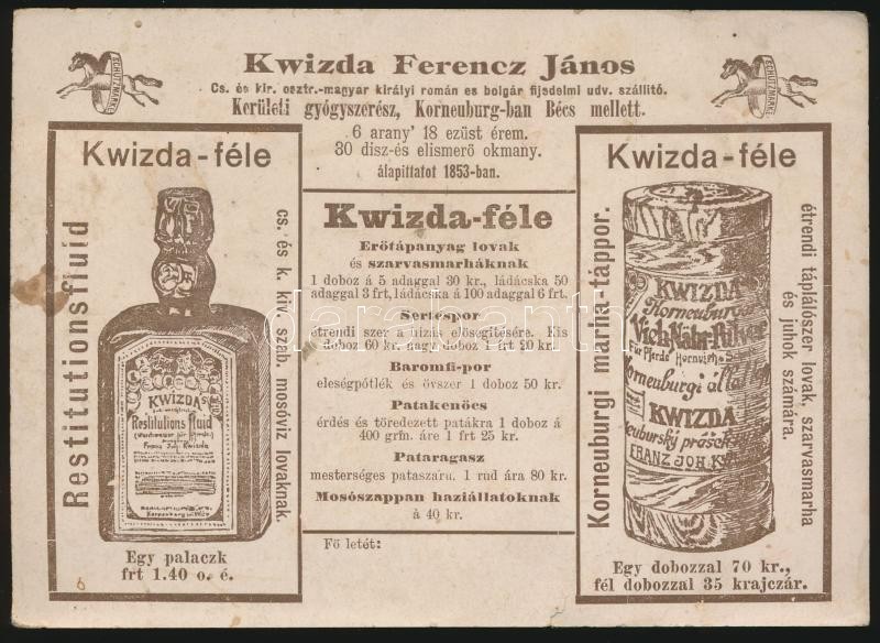 Leírás: cca 1910 Kwizda's Korneuburger Vieh-Nährpulver litho reklámkártyája, 11×15 cm (apró szakadással)