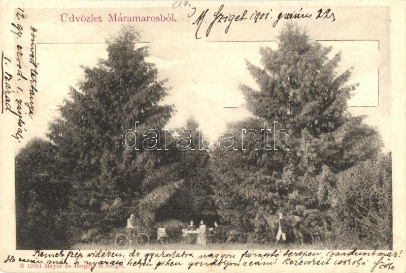 Leírás: Máramarossziget, Sighetu Marmatiei; park piknikezőkkel és kerékpárossal. Mayer és Berger kiadása / park with picnic and bicycle (vágott / cut)