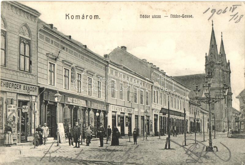 Leírás: Komárom, Komárno; Nádor utca, Rehberger Sándor, Nagy Géza és Gyula, Fektor György, üzletei / street, shops ( ázott sarkak / wet corners)