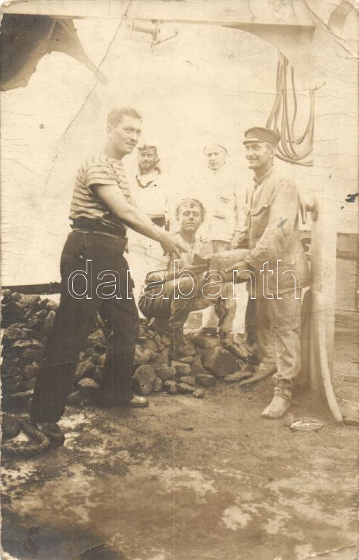 Leírás: 1914 K.u.K. haditengerészek a fedélzeten, szénrakodás / K.u.K. Kriegsmarine, Austro-Hungarian navy, mariners on board, coal loading, photo (EB)