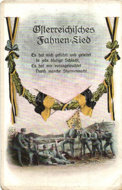 Österreichisches Fahnen-Lied / Austrian flag song, soldiers, WWI milit... https://www.darabanth.com/hu/283-Gyorsarveres/283.0/Kepeslapok/Katonai~200057/Osterreichisches-Fahnen-Lied-Austrian-flag-song-soldiers-WWI-military-feldpost-EK~II1464261
