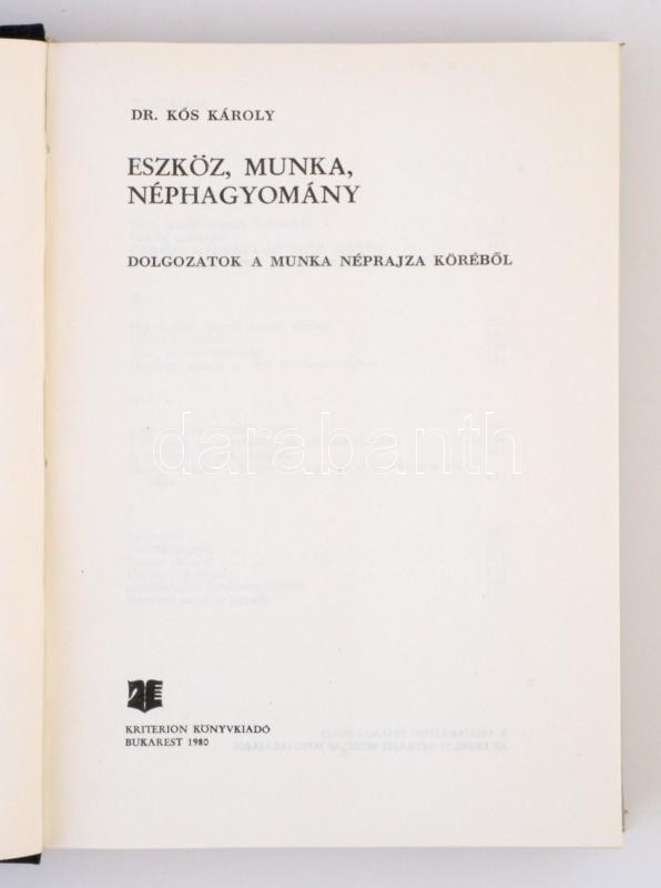 Dr. Kós Károly: Eszköz, munka, néphagyomány. Bukarest, 1980, Kriterion... https://www.darabanth.com/hu/283-Gyorsarveres/283.0/Konyvek/Konyvek-Egyeb-ritkasagok~500002/Dr-Kos-Karoly-Eszkoz-munka-nephagyomany-Bukarest-1980-Kriterion-Kiadoi-egeszvaszon-~II1441640