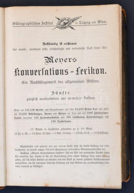 Leírás: Meyers Konversations-Lexikon. 1. köt. Lipcse - Bécs, é. n., Bibliographisches Institut. Színes illusztrációkkal, térképekkel. Kissé megviselt, díszes bőrkötésben.