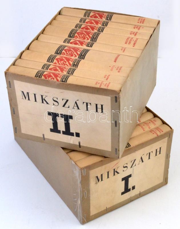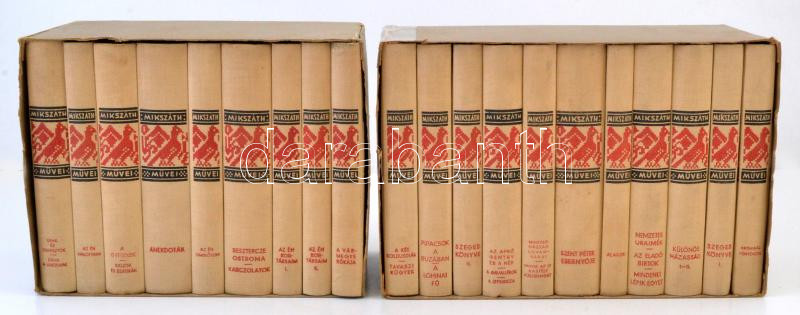 Mikszáth Kálmán összegyűjtött művei. 20 kötetben. Teljes. Bp., 1936, Révai Irodalmi Intézet Rt.-Mikszáth Kálmán Emlékbizottság. Kiadói egészvászon kötés, kiadói papír kartontokban, a kartontokon javítások nyomaival. Jó állapotban.