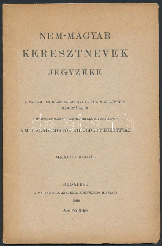 Nem-magyar keresztnevek jegyzéke. Bp., 1909, MTA. Tűzött papírkötésben... https://www.darabanth.com/hu/283-Gyorsarveres/283.0/Konyvek/Konyvek-Egyeb-ritkasagok~500002/Nem-magyar-keresztnevek-jegyzeke-Bp-1909-MTA-Tuzott-papirkotesben-jo-allapotban~II1440264