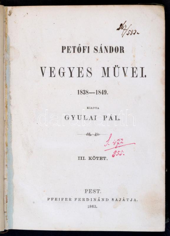 Petőfi Sándor vegyes művei 1838-1849. Kiad.: Gyulai Pál. 3. köt. Pest,... https://www.darabanth.com/hu/283-Gyorsarveres/283.0/Konyvek/Konyvek-Egyeb-ritkasagok~500002/Petofi-Sandor-vegyes-muvei-1838-1849-Kiad-Gyulai-Pal-3-kot-Pest-1863-Pfeifer-Ferdinand~II1468426
