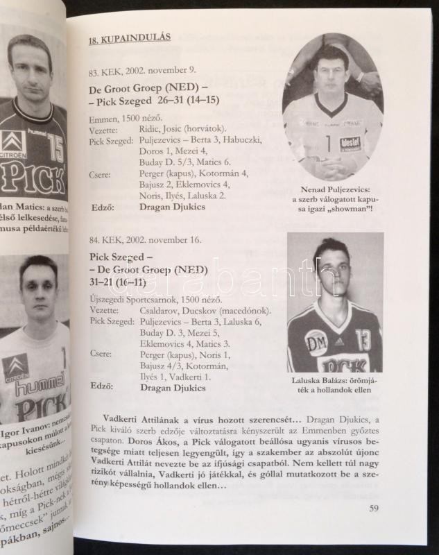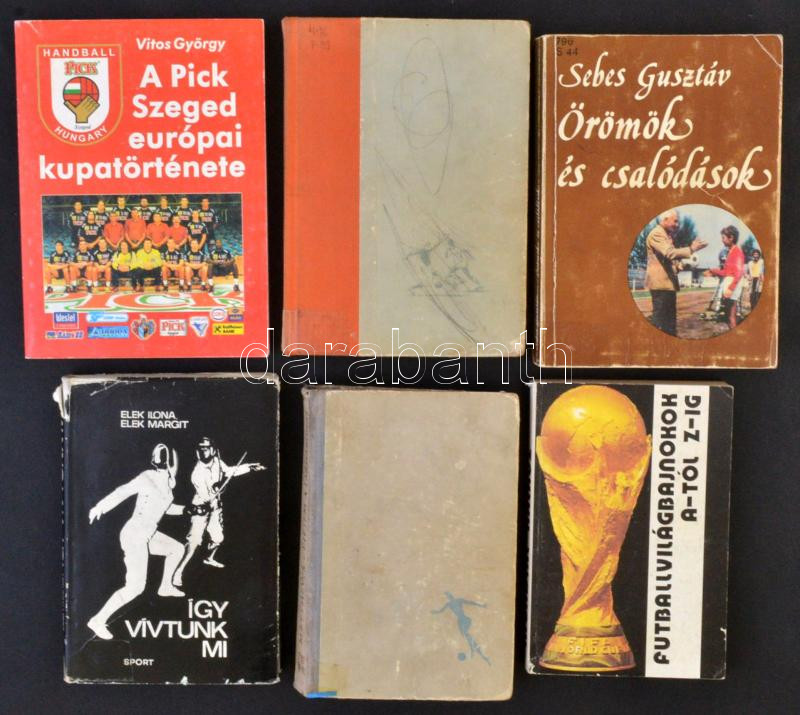 Vegyes sport témájú könyvek: 6 db: Vándor Kálmán: Futballvilágbajnokok A-Z-ig. Bp., 1986, Lapkiadó. Kiadói papírkötés. Elek Ilona, Elek Margit: Így vívtunk mi. Bp, 1968, Sport. Kiadói egészvászon kötés, kiadói kissé szakadt papírborítóban, intézményi bélyegzőkkel. Stanley Matthews: Életem a labdarúgás. Bp., 1964, Sport. Kiadói félvászon kötés, kopottas borítóval, intézményi bélyegzővel. Fekete Pál: Orth és társai (Orth György - Schlosser Imre - Zsák Károly). Bp., 1963, Sport. Kiadói egészvászon kötés, kissé viseltes kopott, firkált borítóval, intézményi bélyegzővel. Sebes Gusztáv: Örömök és csalódások. Egy sportvezető emlékei. Bp.,1981, Gondolat. Kiadói papírkötés, kopottas borítóval, intézményi bélyegzővel. Vitos György: A Pick Szeged európai kupatörténete. Szeged, 2004, Szerzői kiadás. Kiadói papírkötés.