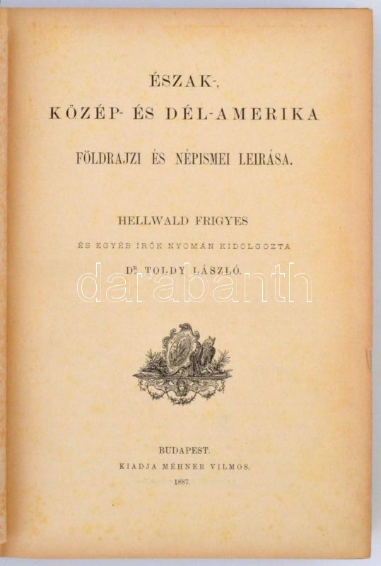 A föld és népei I-III. Föld és Népismei Kézikönyv. Hellwald Frigyes és egyéb írók nyomán kidolgozta Dr. Toldy László. Előszőval bevezette: Dr. Hunfalvy János. I. Észak-, Közép és Dél-Amerika földrajzi és népismei leírása. II. Afrika, Ázsia és Ausztrália földrajzi és népismei leírása. III. Európa földrajzi és népismei leírása. Különös tekintettel Magyarországra a legujabb statisztikai adatok alapján dolgozta György Aladár. Budapest, 1887-1880-1881, Méhner Vilmos, [4] + VIII + 722 + IV p. ; 672 p.; VIII + 9-656 p. Kiadói egységes, festett, dúsan aranyozott egészvászon kötés, kissé kopottas borítóval, és gerinccel, de alapvetően jó állapotban, térképmelléklettel, gazdag szövegközti és egészoldalas képanyaggal, márványozott lapélekkel.
