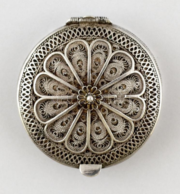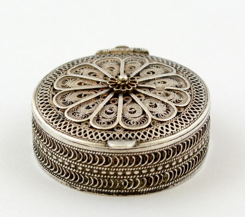 Leírás: Ezüst(Ag) filigrán dobozka, jelzett, d: 4 cm, nettó: 16,5 g