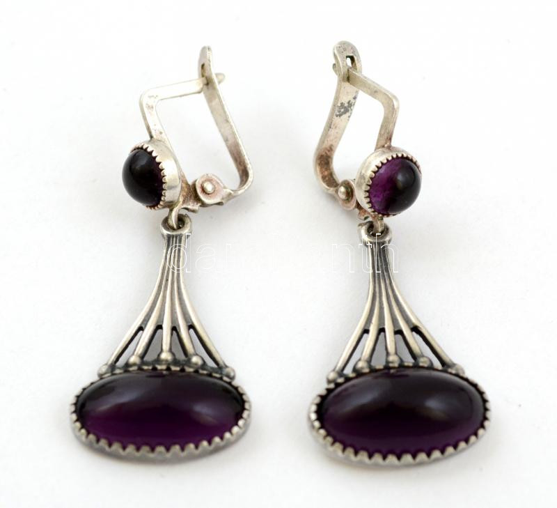 Leírás: Ezüst(Ag) fülbevalópár, szintetikus lila kövekkel, jelzett, 6,7 g